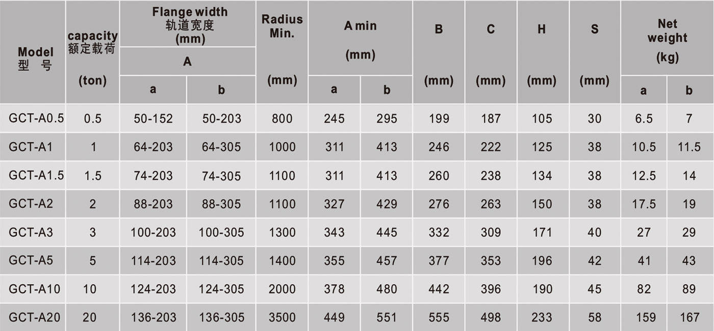 山東五牛GCT-A 手推單軌小車指標參數圖: