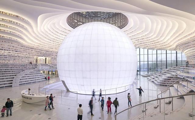 這個圖書館共有6層,室內裝修別出心裁。圖書館整體造型前衛并且有科技感,整體采用的是鋼框架和玻璃幕墻結構,從遠處看如同一只鑲嵌的大眼睛。話說這鋼框架的設計使用可是耗費了大量的人力、物體,框架較高一般的機械設備無法吊運,最后裝修工人使用手拉葫蘆與單軌小車才完成鋼框架的吊運安裝作業,這也成為了書店裝修的點睛之筆。
